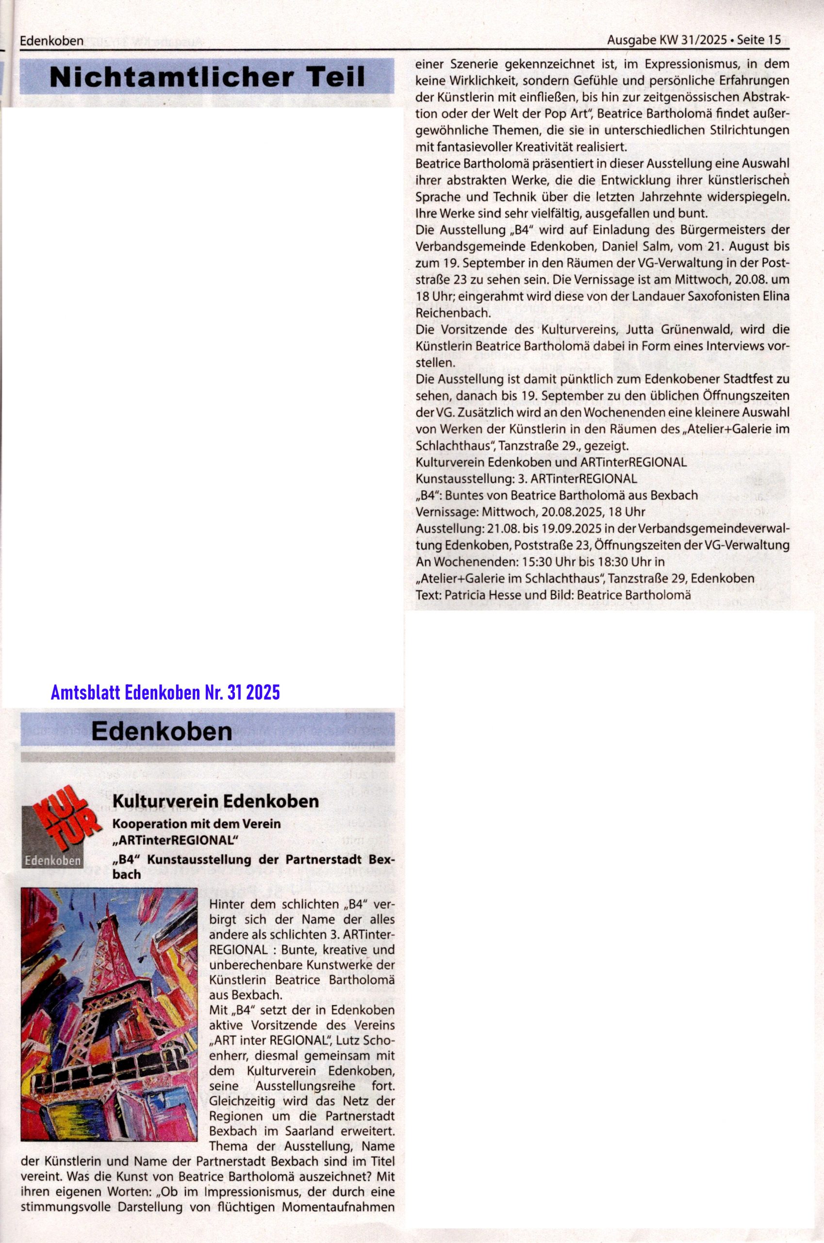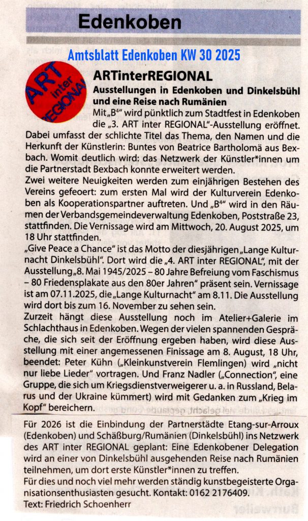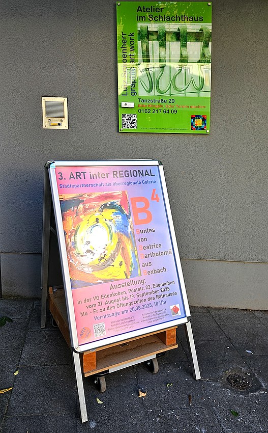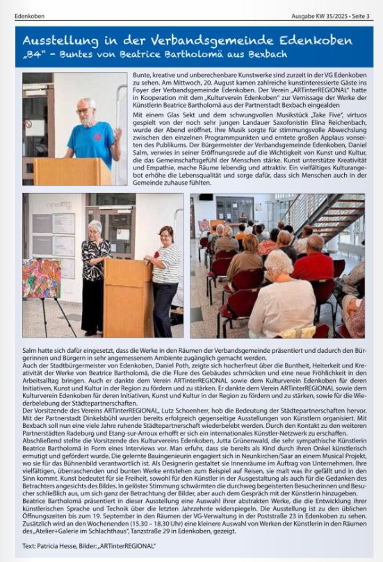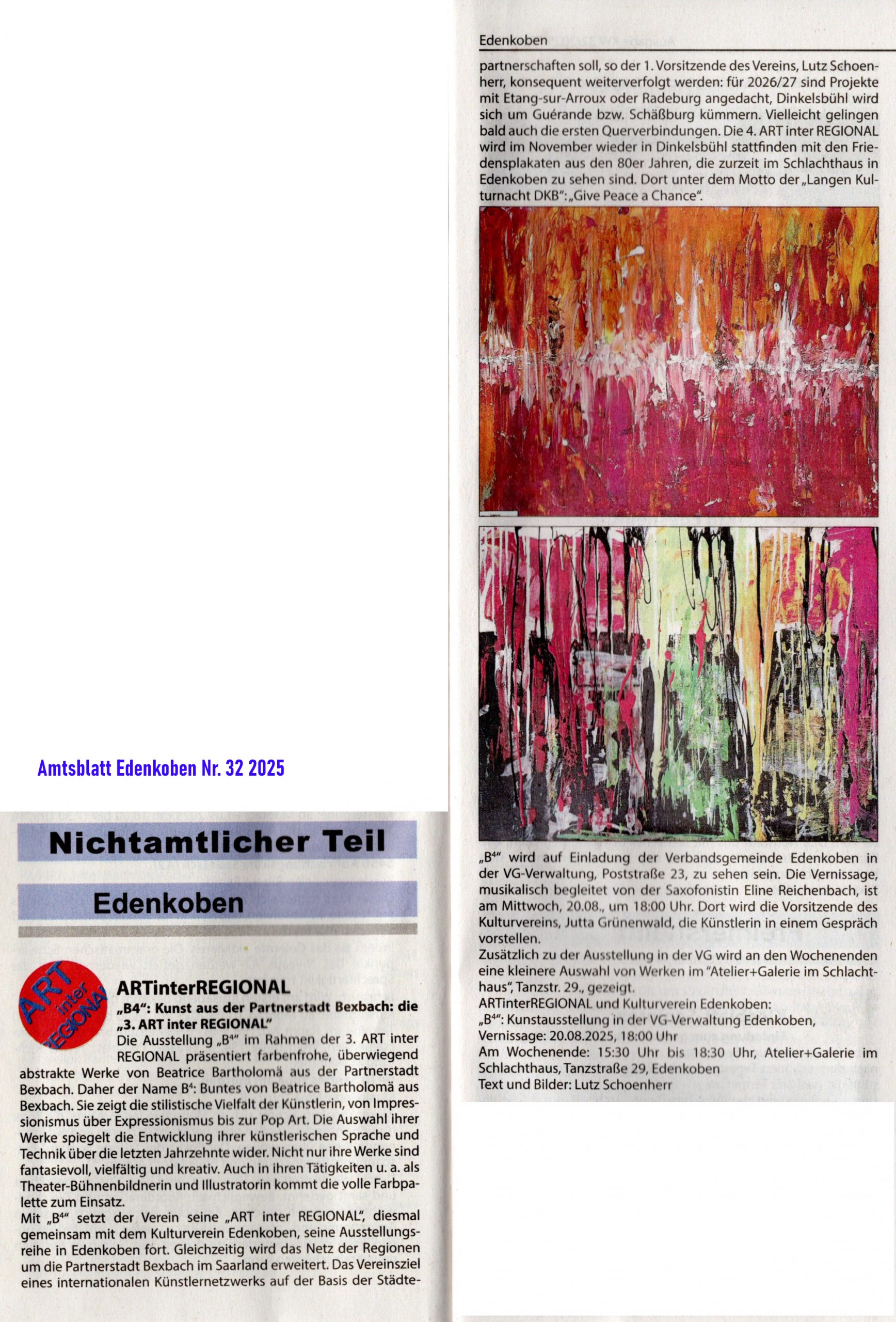 Mit der Ausstellung B4: Buntes von Beatrice Bartholomä aus Bexbach ist es gelungen, eine weitere Partnerstadt von Edenkoben in das Netzwerk von ARTinterREGIONAL einzubinden. Vielleicht wird es so gelingen, die Städtepartnerschaft auf diese Weise wieder mit Leben zu füllen.