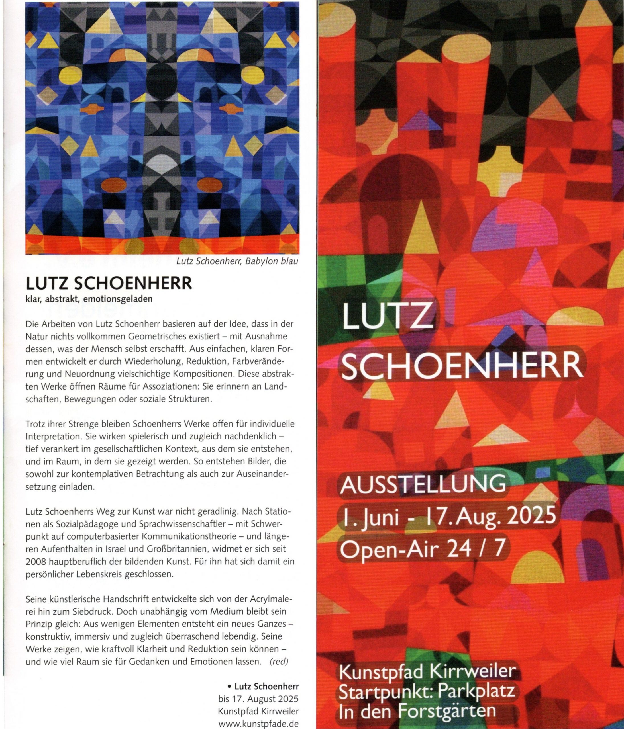 Lutz Schoenherr macht seine Bilder mit Farben. Mit Farbklängen, um genau zu sein. Ihr Ausgangspunkt sind fast immer geometrische Grundformen wie Kreis (auch Halb- oder Viertelkreis), Quadrat und Dreieck. Natürlich sind sie nicht vollkommen bedeutungsfrei, schließlich assoziiert man unwillkürlich das ästhetische Programm des Bauhaus, der De-Stijl-Bewegung, des „offenen Kunstwerks“ (Umberto Eco).