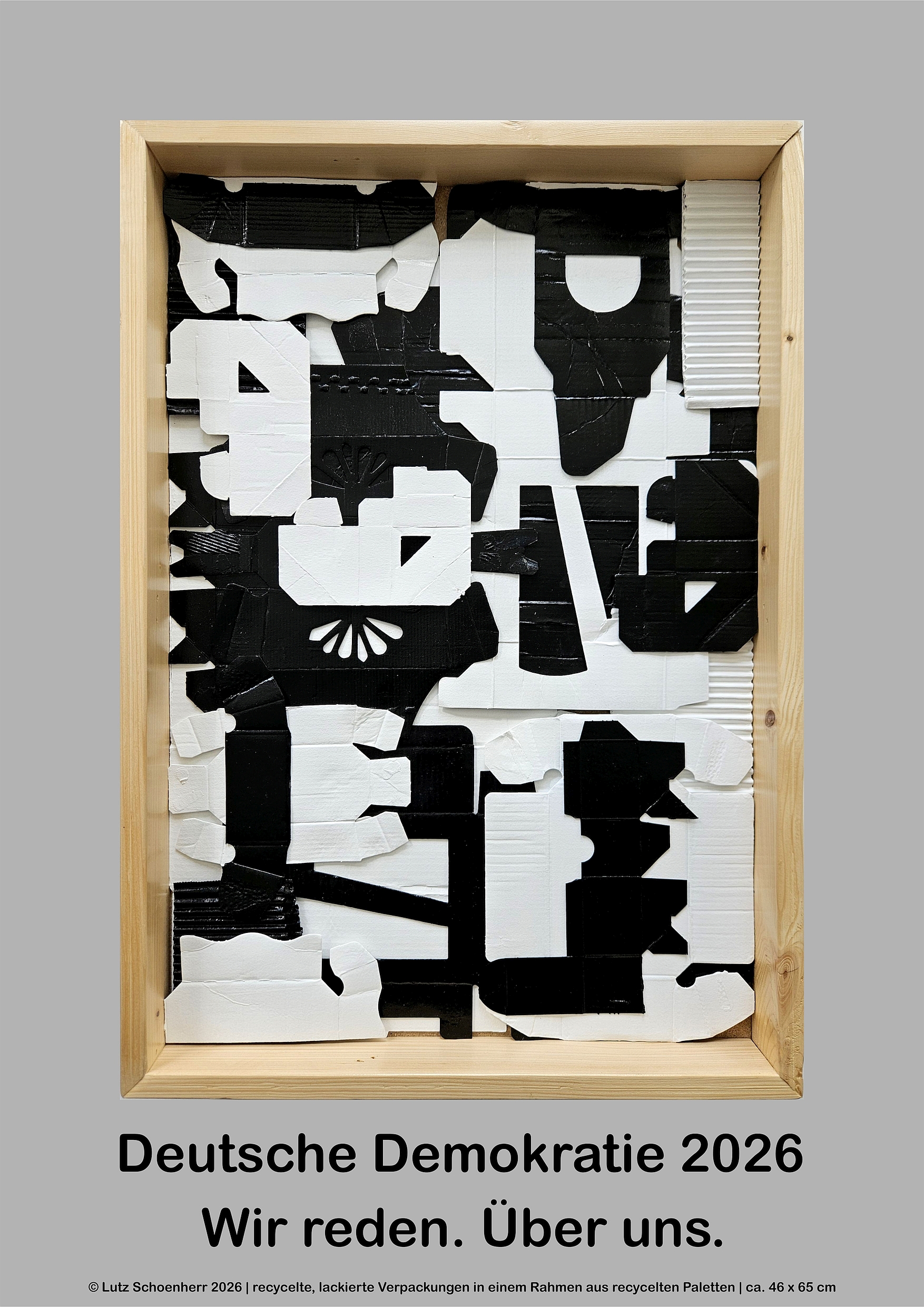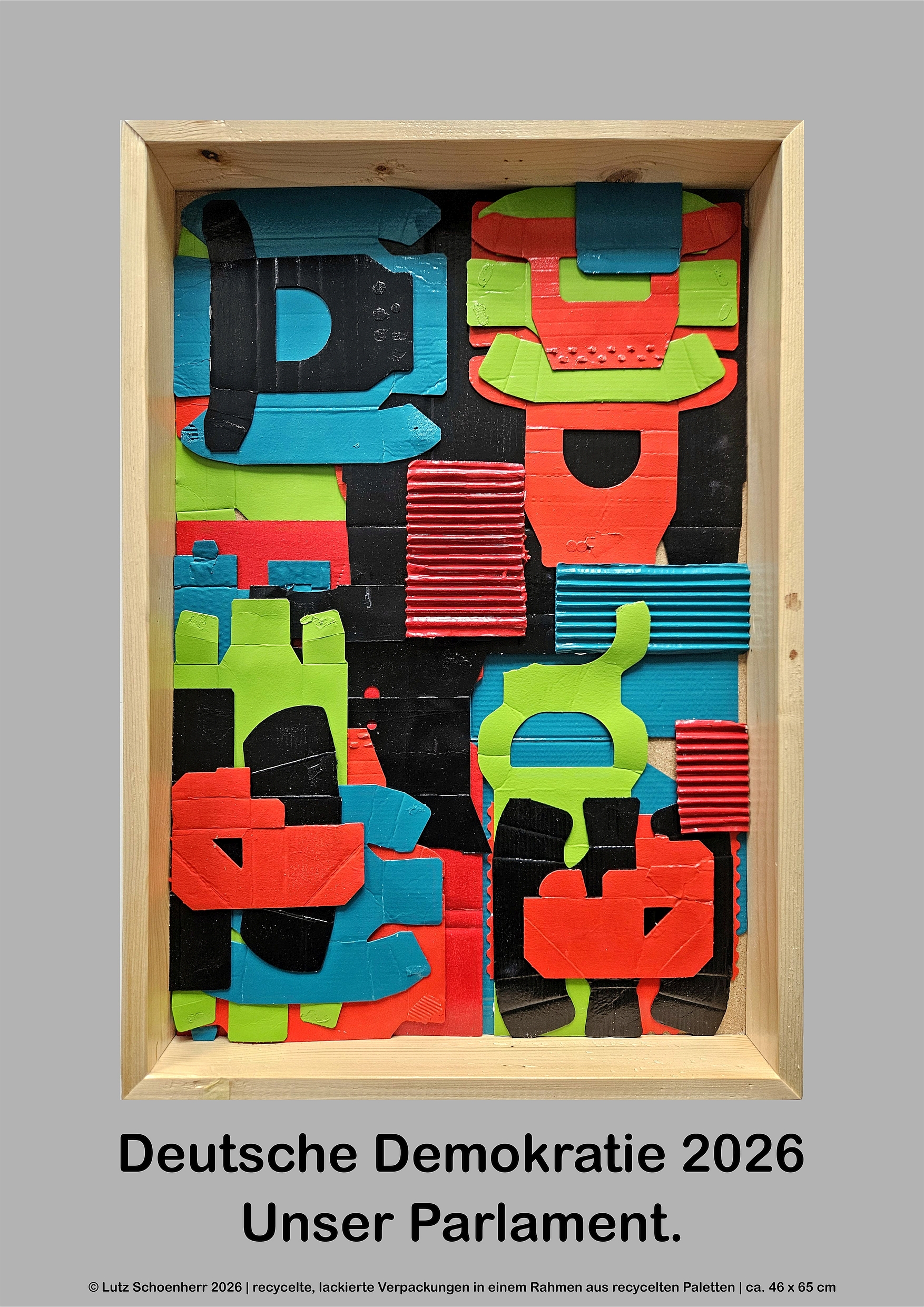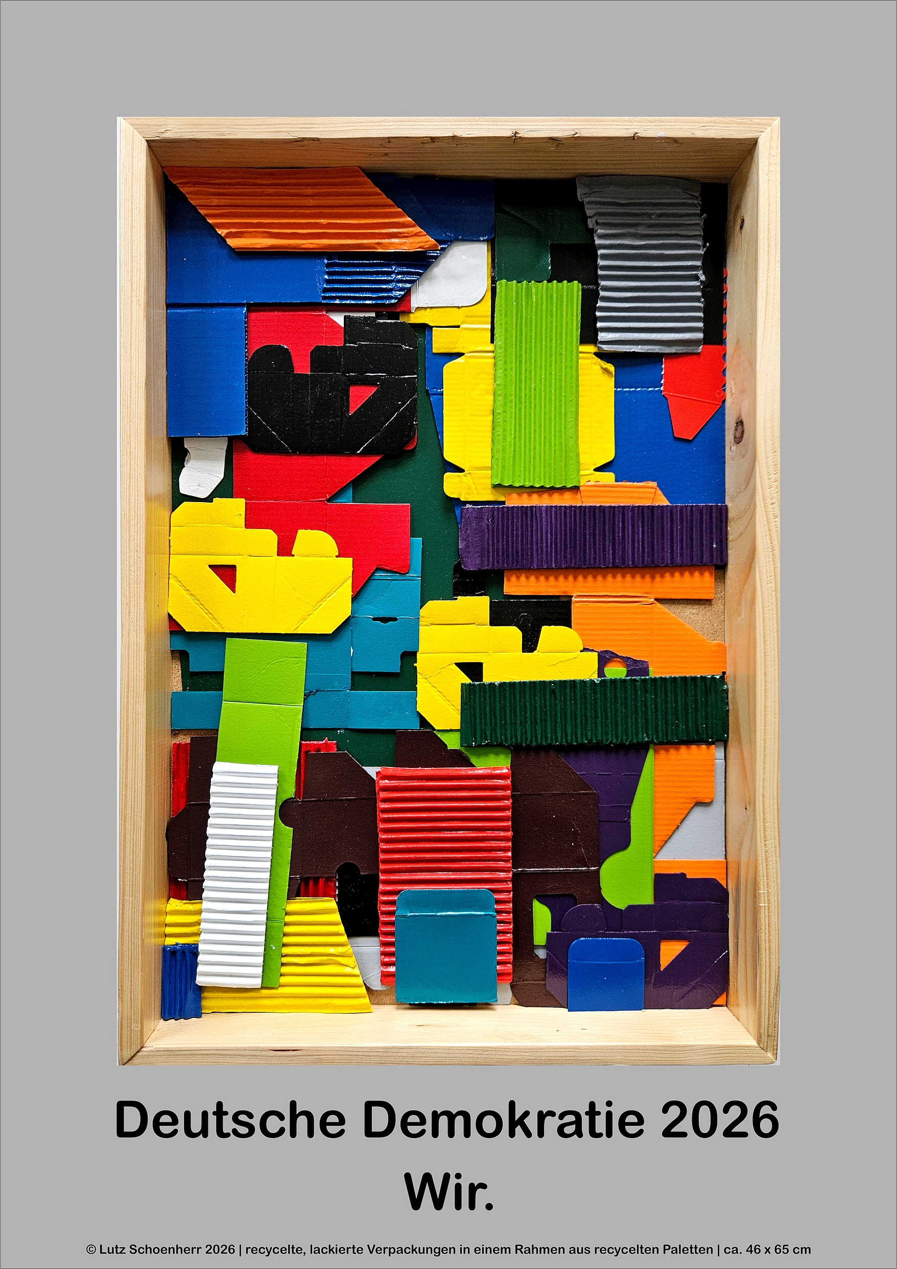 Dies Werk besteht aus zu 100% aus recycelten Materialien: Die farbigen Elemente sind aus beidseitig lackierten Schnipseln aus Verpackungskarton hergestellt. Die Rahmen waren in ihrem früheren Leben hölzerne Paletten für Waschmaschinen, Wäschetrocknern, Kühlschränken.